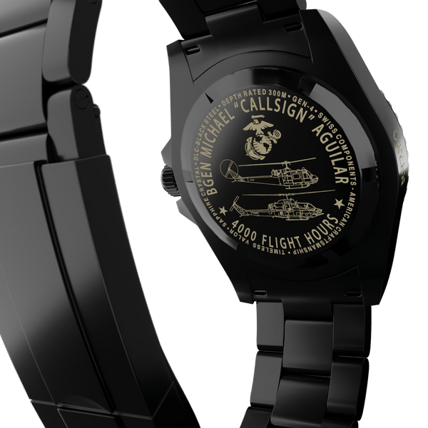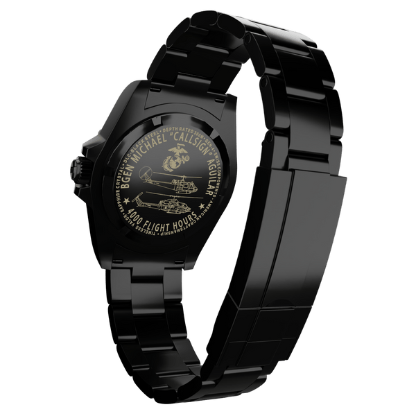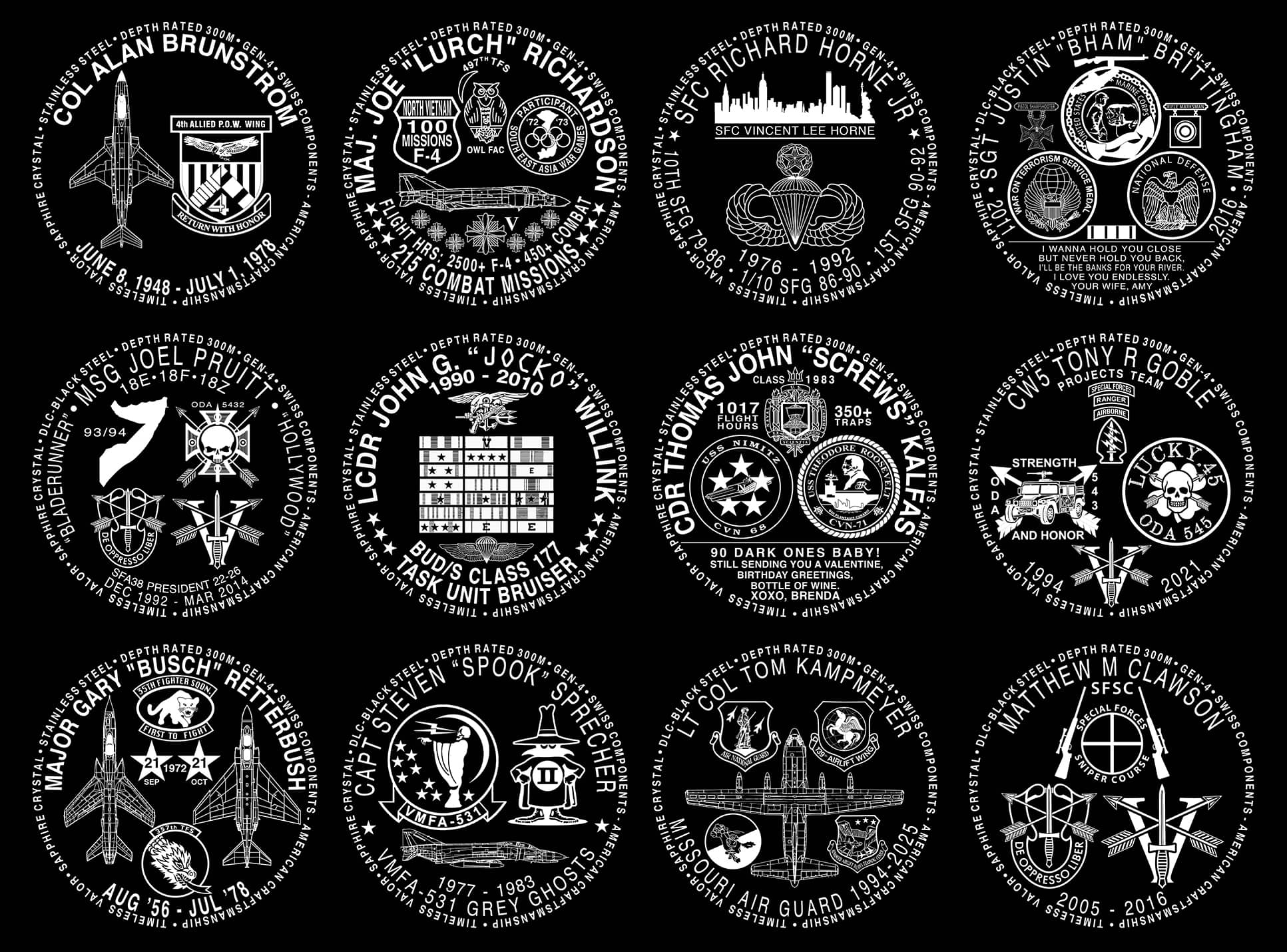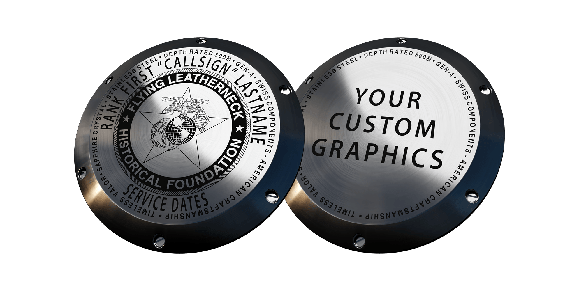 • Standard caseback with FLHF or FLAM round logo and your rank, name, callsign, and service dates.