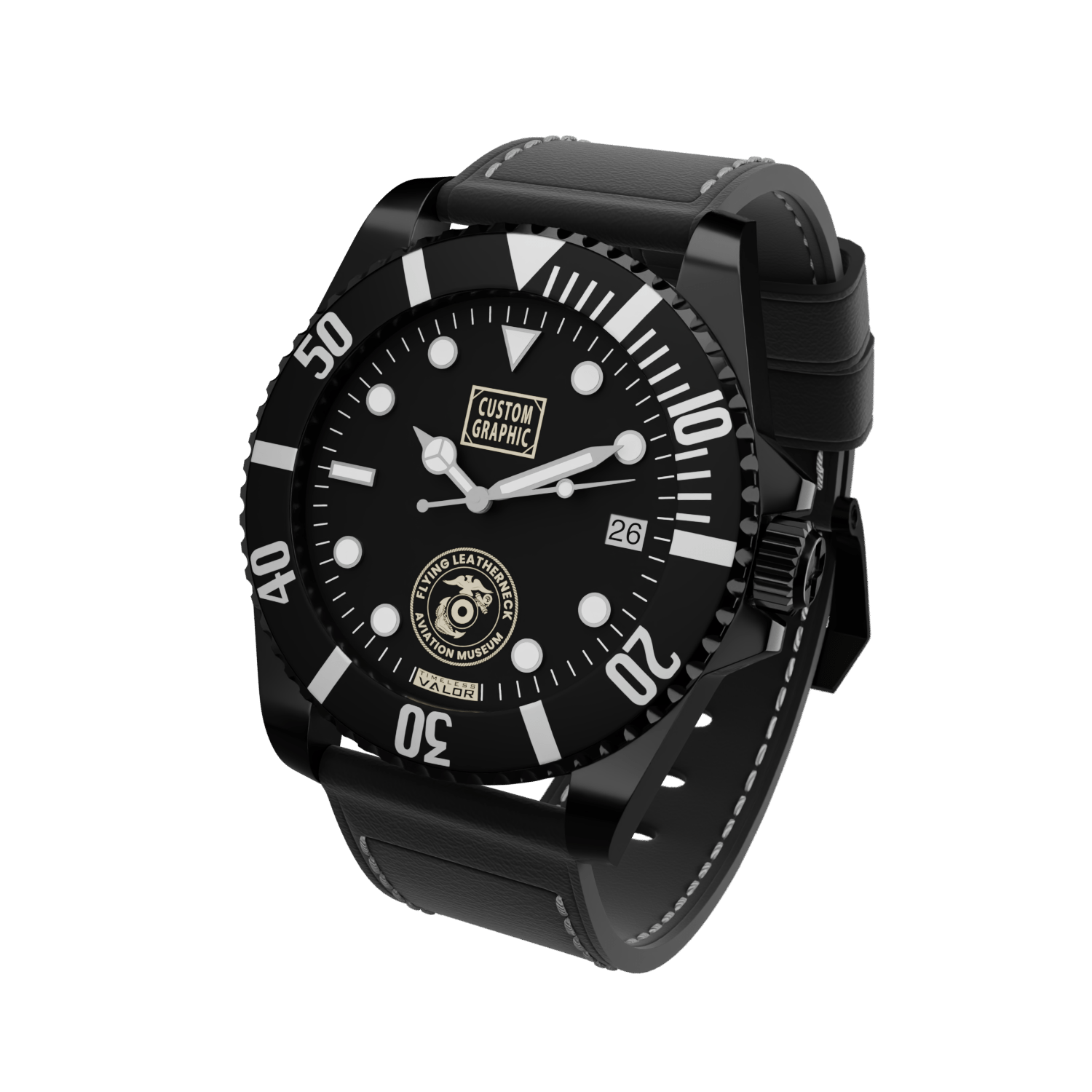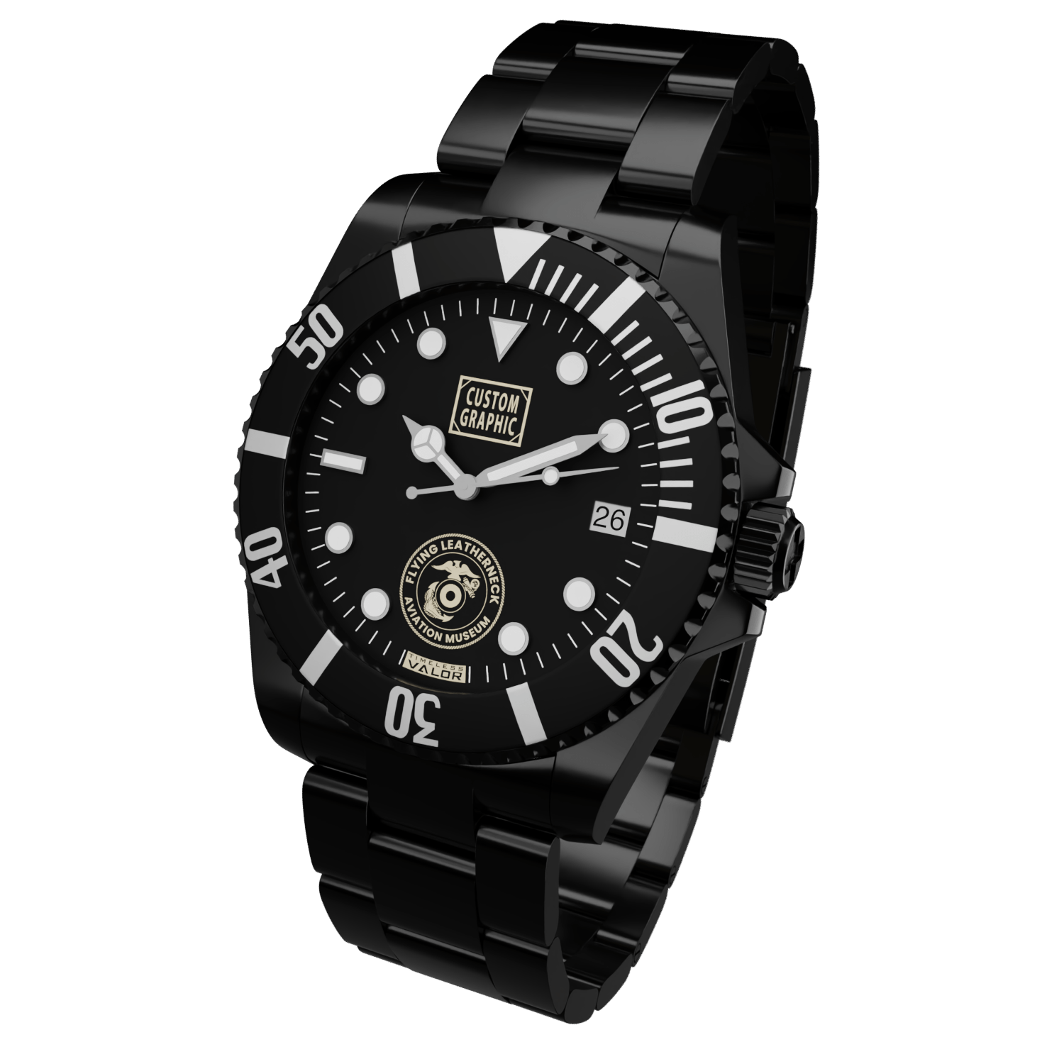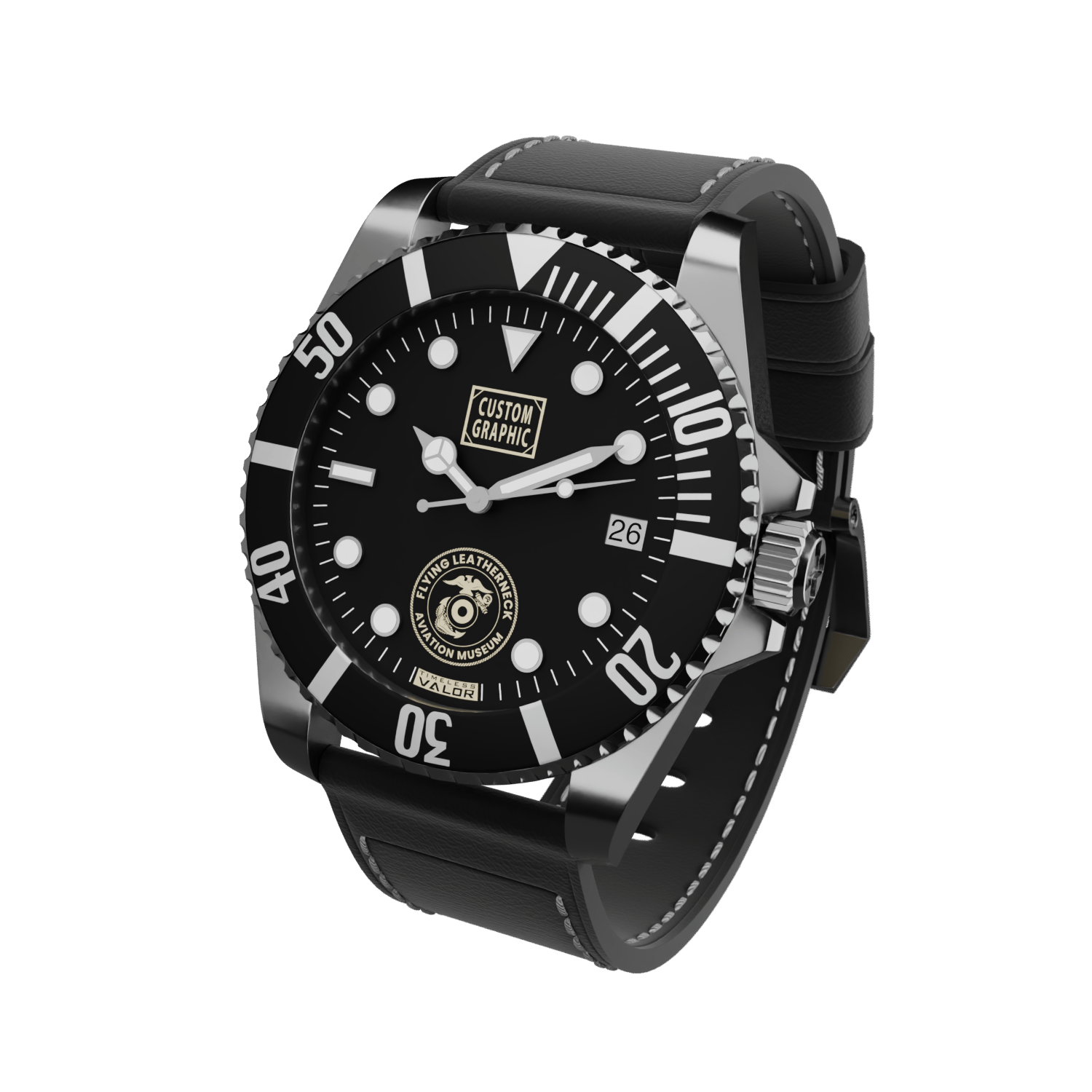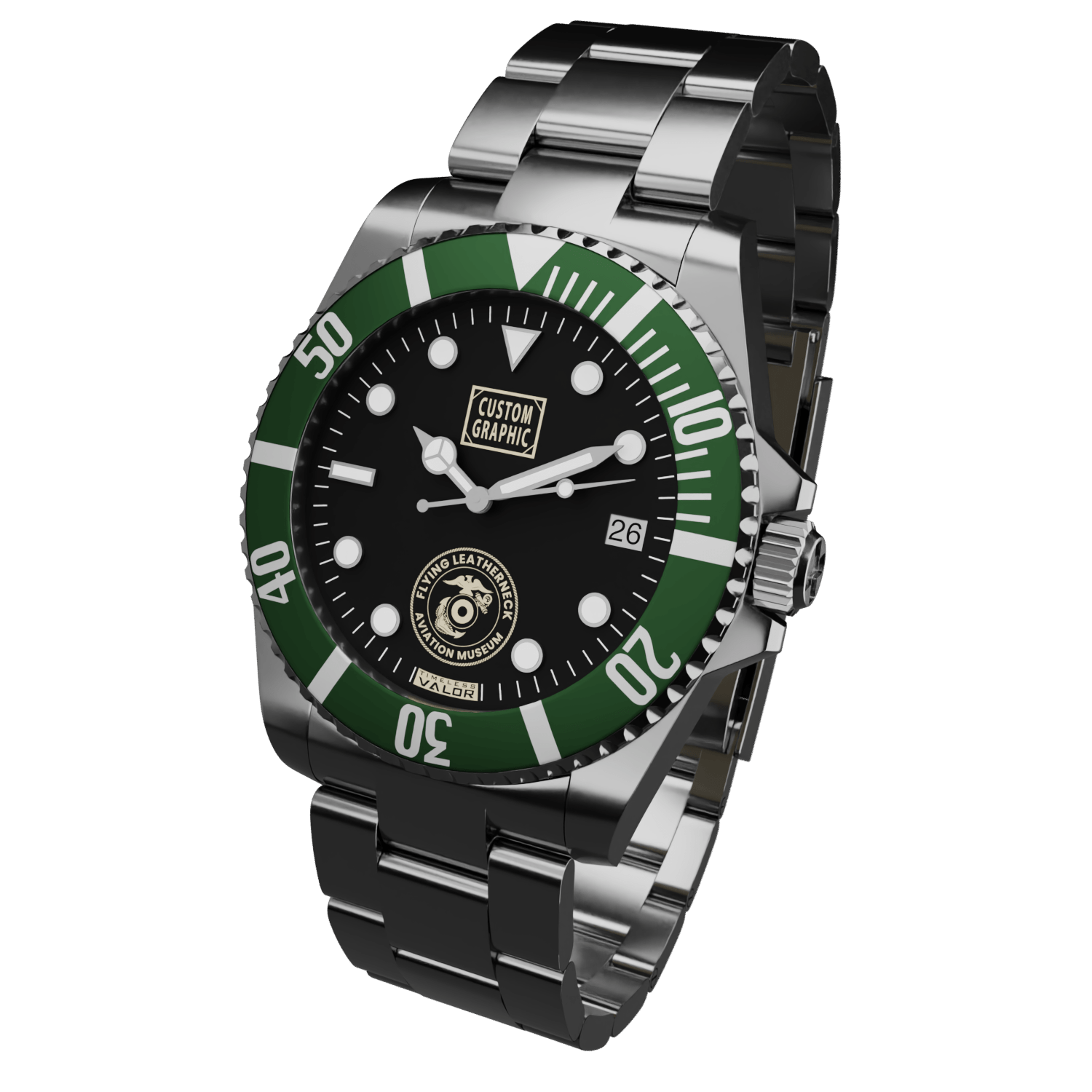 The dial honors the Flying Leatherneck Historical Foundation and offers 2 dial configurations with open spot @12 for your custom graphics (wings/patch/aircrew/etc), executed in a refined gold application.