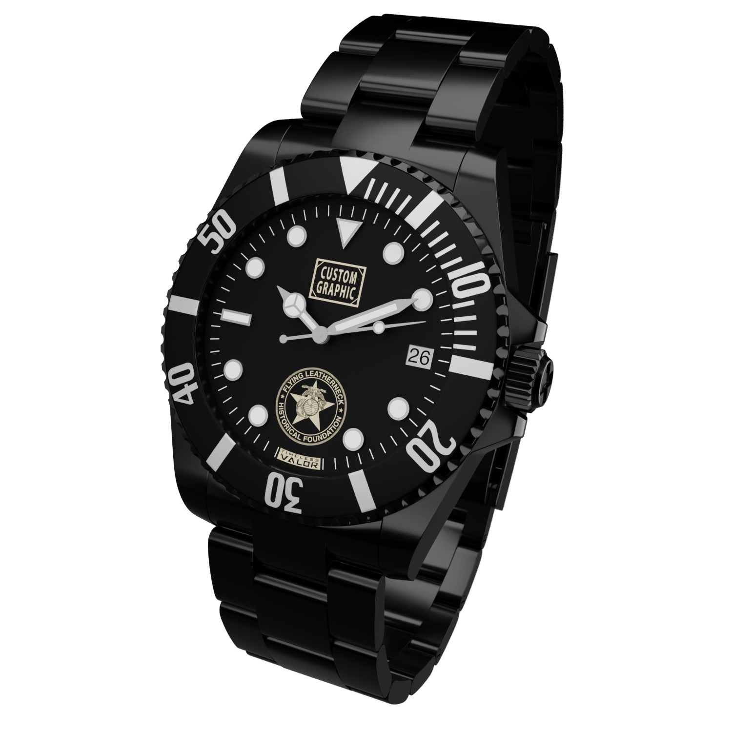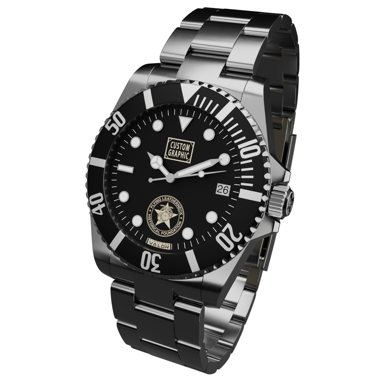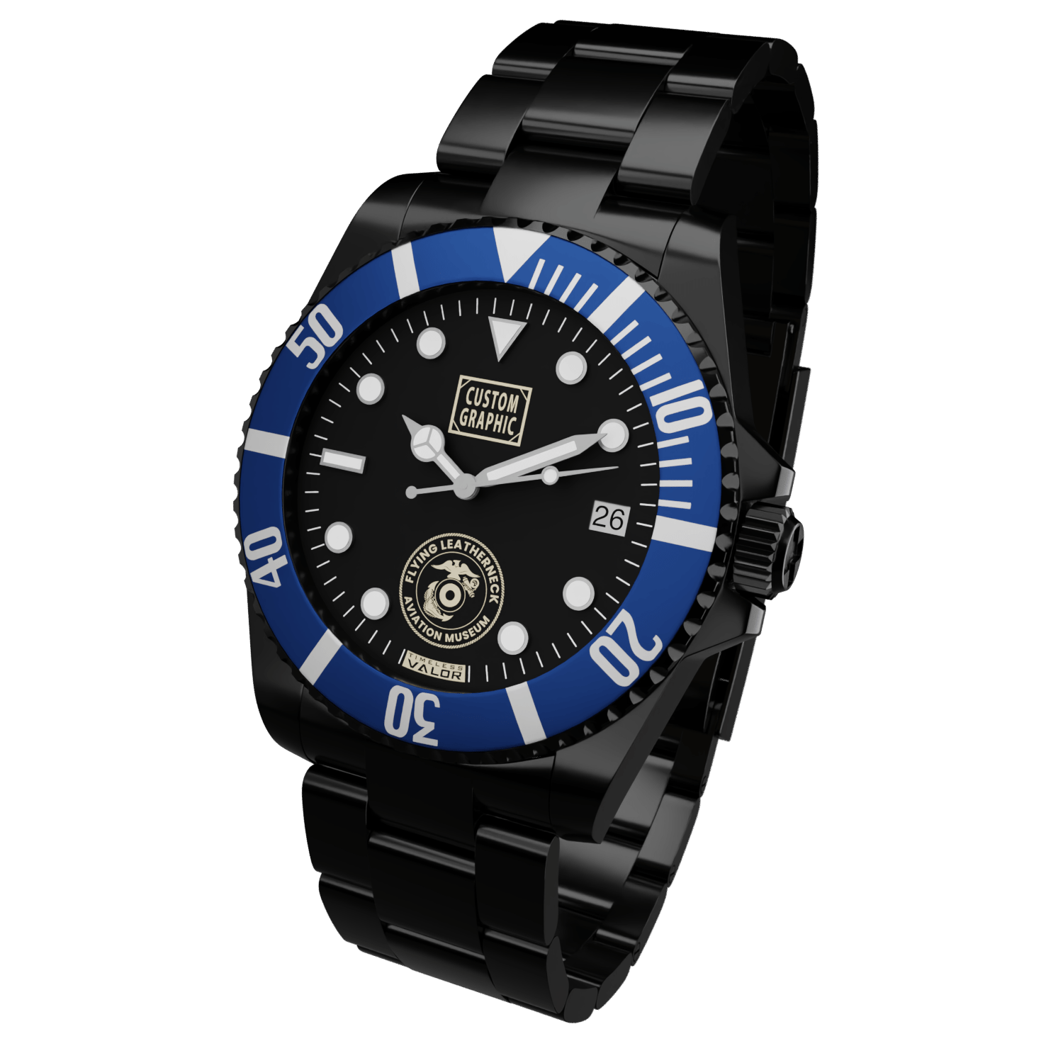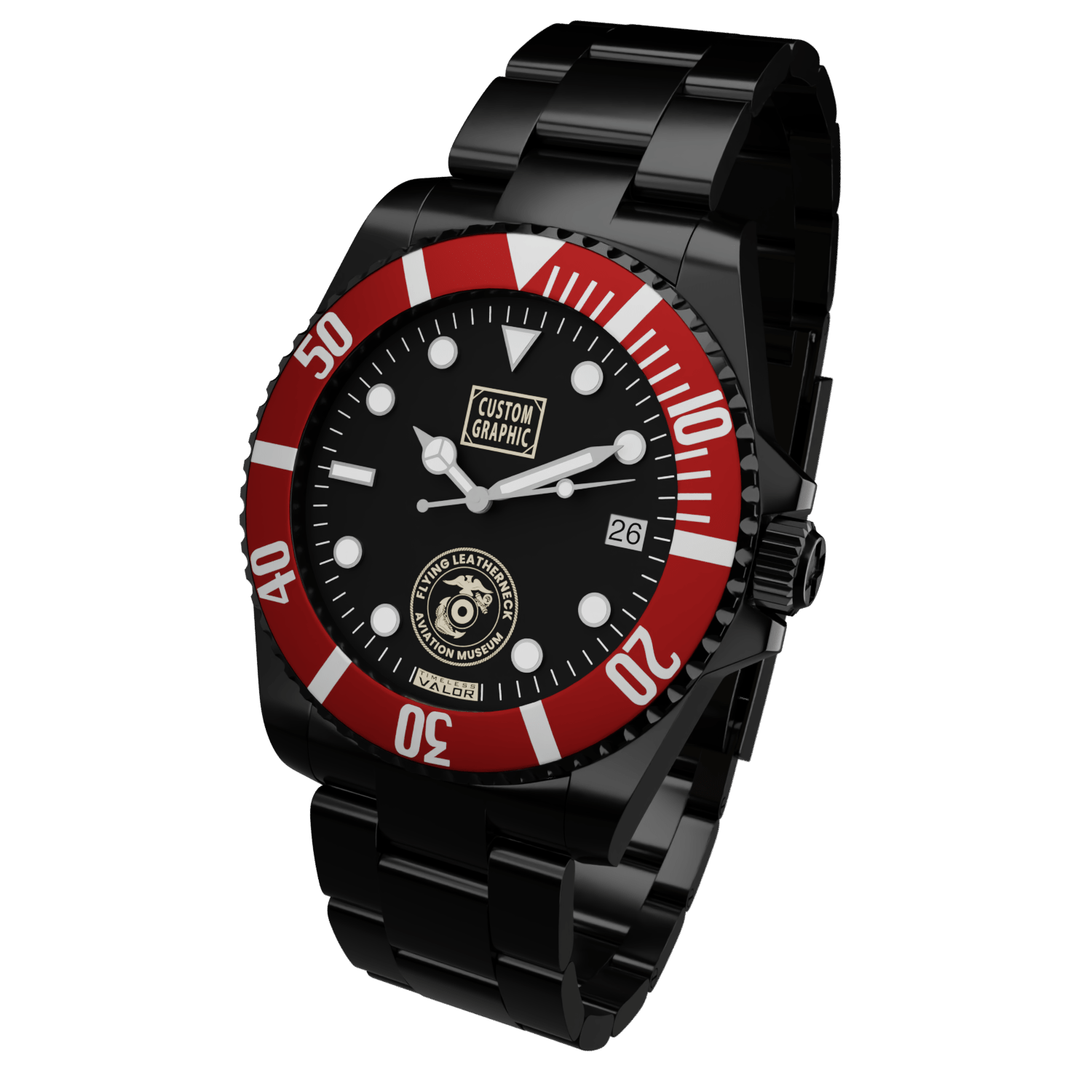 The dial honors the Flying Leatherneck Historical Foundation and offers 2 dial configurations with open spot @12 for your custom graphics (wings/patch/aircrew/etc), executed in a refined gold application.