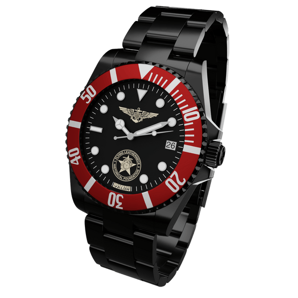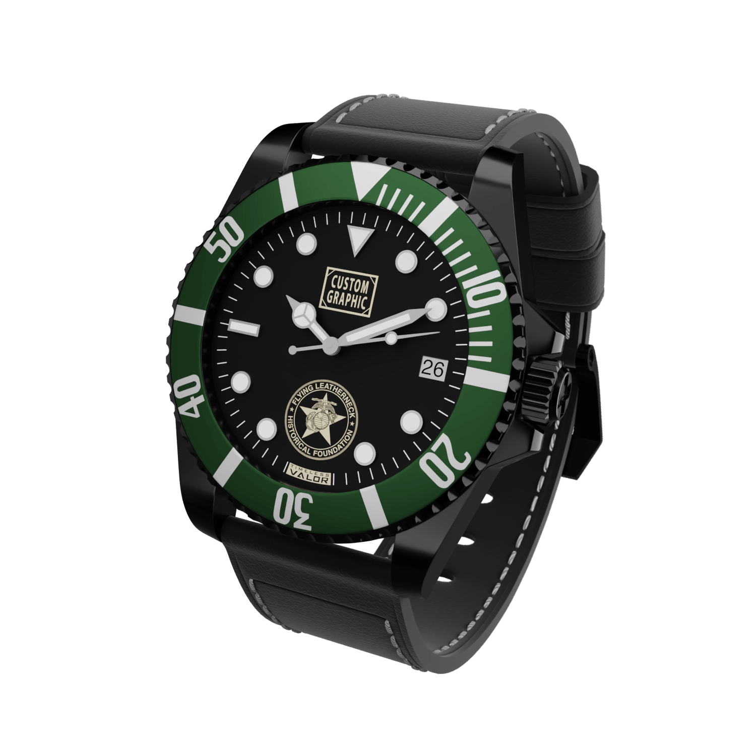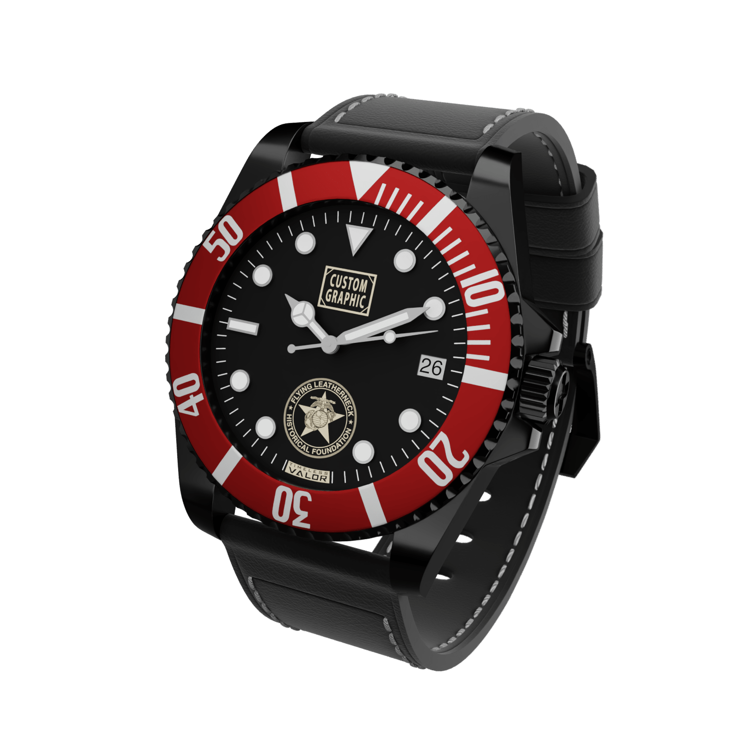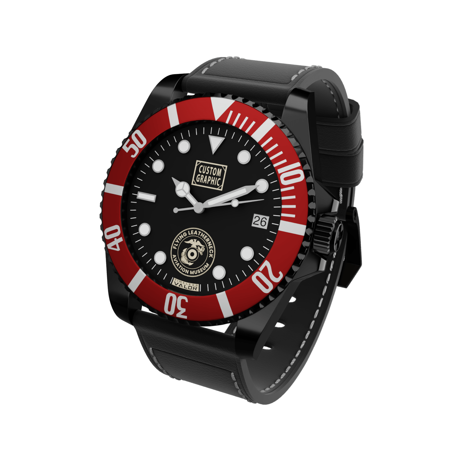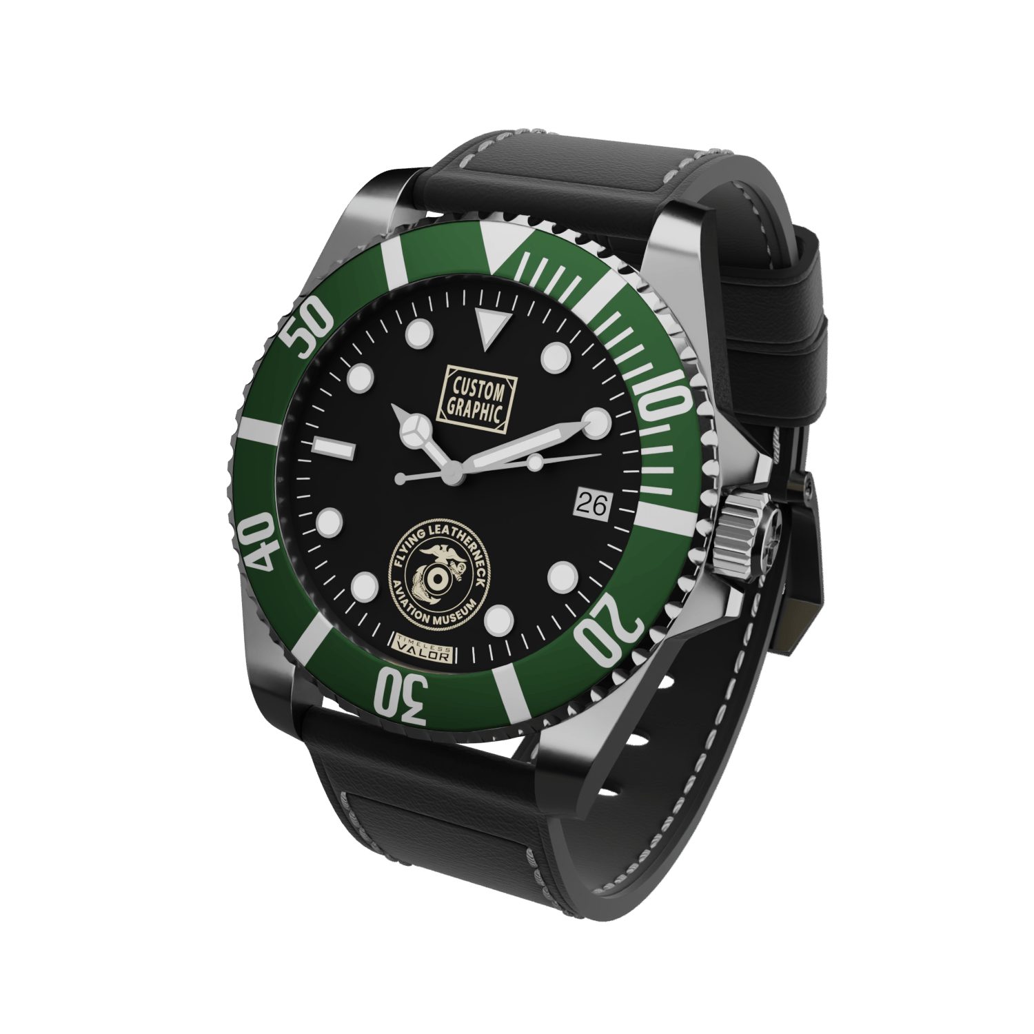 The dial honors the Flying Leatherneck Historical Foundation and offers 2 dial configurations with open spot @12 for your custom graphics (wings/patch/aircrew/etc), executed in a refined gold application.