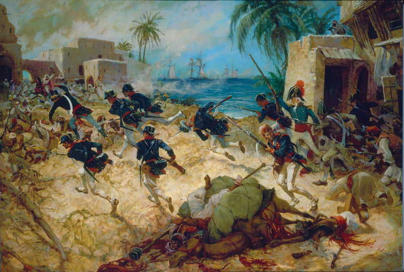 A detachment of 8 Marines, commanded by Lt Presley O’Bannon, supported a mercenary army of Greek and Arab soldiers under the command of Consol Eaton. After completing a foot march of over 520 miles from Egypt to Libya, they conducted an assault on the city of Derna on 27 April, 1805.